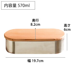 サイズ 約 幅 19.7cm × 奥行 8.2cm × 高さ 6cm 容量 約 570ml 重量 約 186g 素材 本体:18-8ステンレス鋼(クローム18% ニッケル8%) フタ:杉(古代杉) バンド:ゴム 生産国 日本 【p2】 錆びないチタンを使った日本製フードボックス。