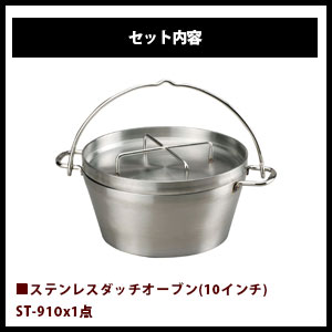 商品名 SOTO/ソト グリル&ダッチオーブン3点セット アウトドア・キャンプ用品 商品説明&商品仕様 ≪セット内容≫ ・ステンレスダッチオーブン10 inch ST-910 数量:1 ・DUAL GRILL ST-930 数量:1 ・ダッチオーブンスタンド ST-9304 数量:1 ≪ ステンレスダッチオーブン10 inch ST-910≫ 本体サイズ:幅35×奥行28×高さ16cm 重量:5.2kg 材質:ステンレス(底網:ステンレス) 原産国:日本 満水容量:5.2L サイズ:内径25.9×深さ11.5cm 付属品:底網 ●備考 ●蓄熱性に優れた4ミリ厚のステンレス鋼板。