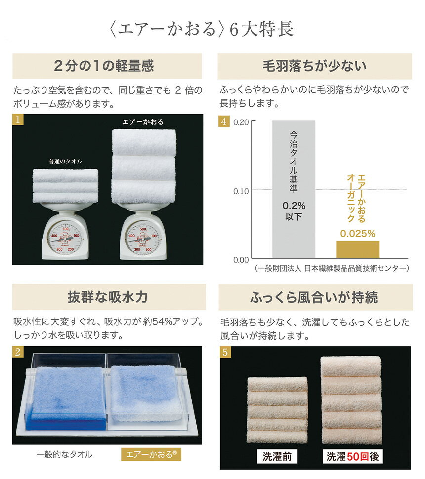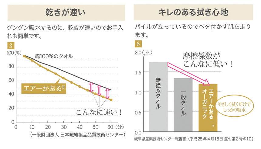 ・「エアーかおる」は、糸1本1本にパーマのような撚りをかけることで、糸の間にたっぷりと空気を含み、ふんわりとした肌触りと優れた吸水性が特長。